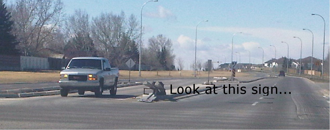 Yes, that sign blew over and yes, those two things sticking up are CEMENT things, that are usually in parking lots, that were holding the sign in place! CRAZY!!!! I drive through this intersection about five million times a day (well, not that many, but some days it certainly feels like it!) and this is the second time this spring I've seen that sign laying down because of the wind. We've had wind warnings the last few days and we go to bed at night listening to the howling of the wind hoping that all our siding and shingles will still be on our house in the morning!!!!! And, knock on wood, so far all is good at our house except for the tiles in our patio table! But I've seen lots of pieces of siding and other building materials blowing around the neighborhood the last little while!